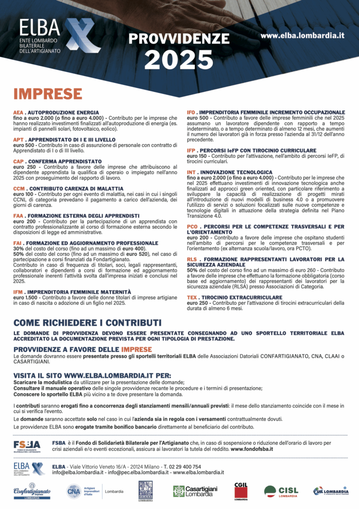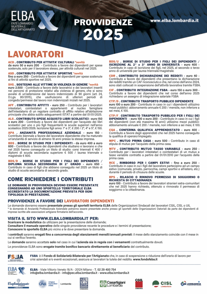 Sono online sul portale dell’Ente Lombardo Bilaterale per l’Artigianato ELBA tutti i moduli relativi alla cosiddette “provvidenze” (leggi contributi a fondo perduto) per il 2025 a imprese in regola con i versamenti Ebna/Elba/Fsba e lavoratori per il 2025.