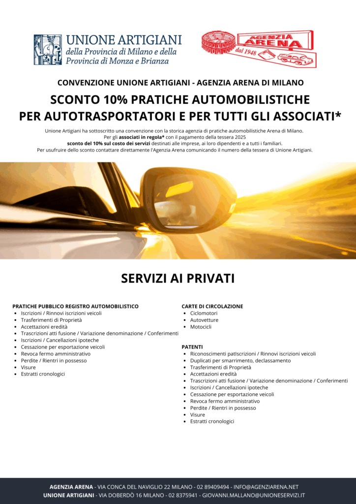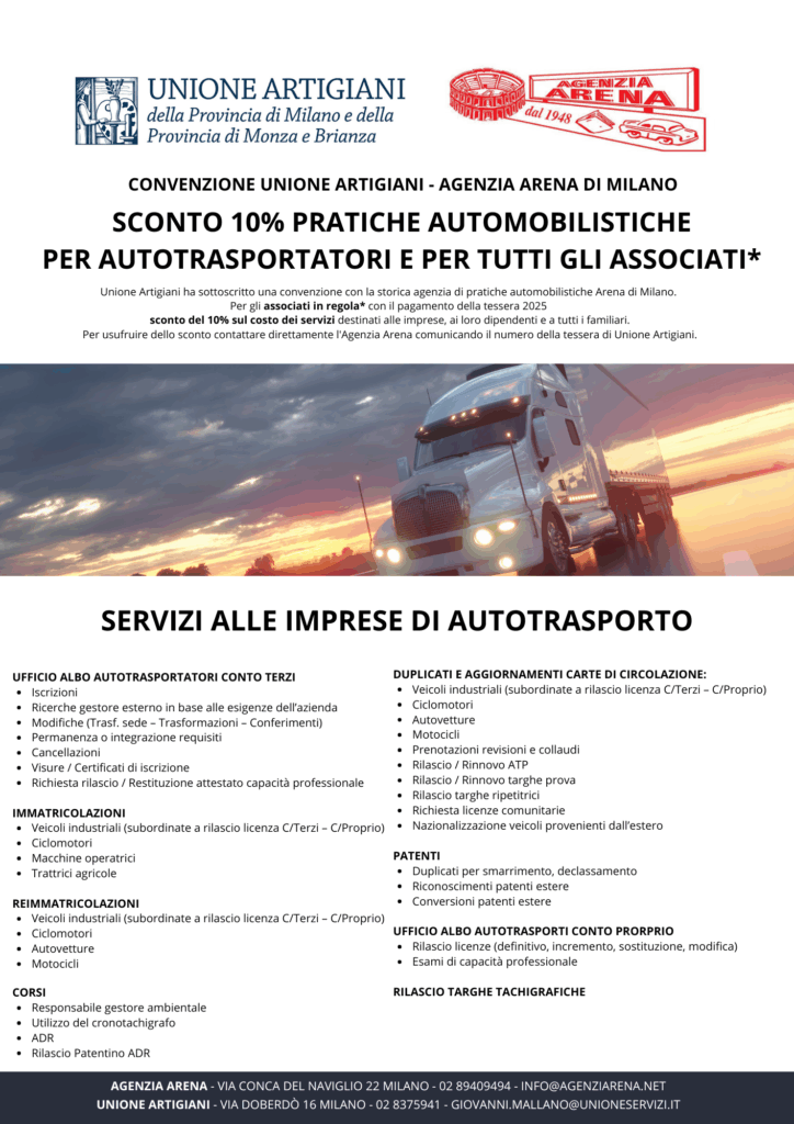 PRATICHE AUTO E AUTOTRASPORTATORI, SCOPRI LA CONVENZIONE CON L’AGENZIA ARENA DI MILANO. SCONTO 10% PER AUTOTRASPORTATORI, IMPRESE ASSOCIATE, TITOLARI E FAMILIARI